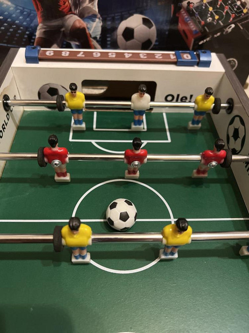В хорошем состоянии, все работает-крутится, мячик есть, единственное - небольшое пятно на стенке поля, что никак не влияет на игру (на предпоследнем фото это видно). В комплекте так же есть запасные детали, инструкция и второй мяч. Компактная, качественная и крепкая игрушка, сделана из дерева, прослужит Вам ещё много лет)