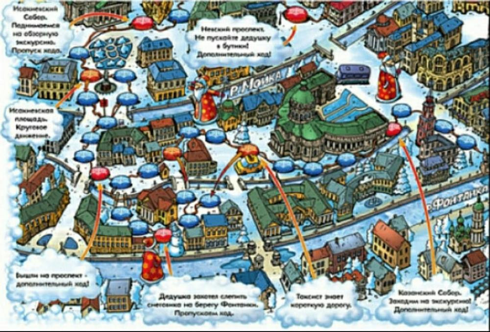 Сувенирная настольная игра-шагалка имет красочное игровое поле, представляющее собой стилизованную карту центра Санкт-Петербурга. Главный герой новогоднего праздника Дед Мороз путешествует вместе с игроками, осматривая достопримечательности, отмеченные на карте. Новогодняя игра-бродилка знакомит Вашего малыша с культурными объектами Северной столицы России, помогает ему научиться читать, развивает внимание, способствует формированию интереса к изучению родной страны. Состав игры: красочное поле размером 57 х 42 см, 4 фишки, шестигранный кубик. Возраст: от 4 лет. Рекомендуется для тех, кто умеет или учится читать. Настольная печатная игра упакована в красочную новогоднюю подарочную коробку-книжку. Эта игра обязательно понравится Вашему малышу и поможет весело и с пользой встретить Новый год!