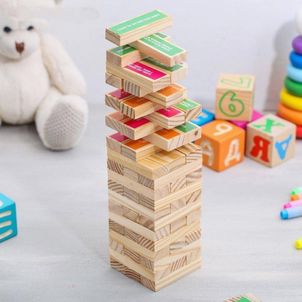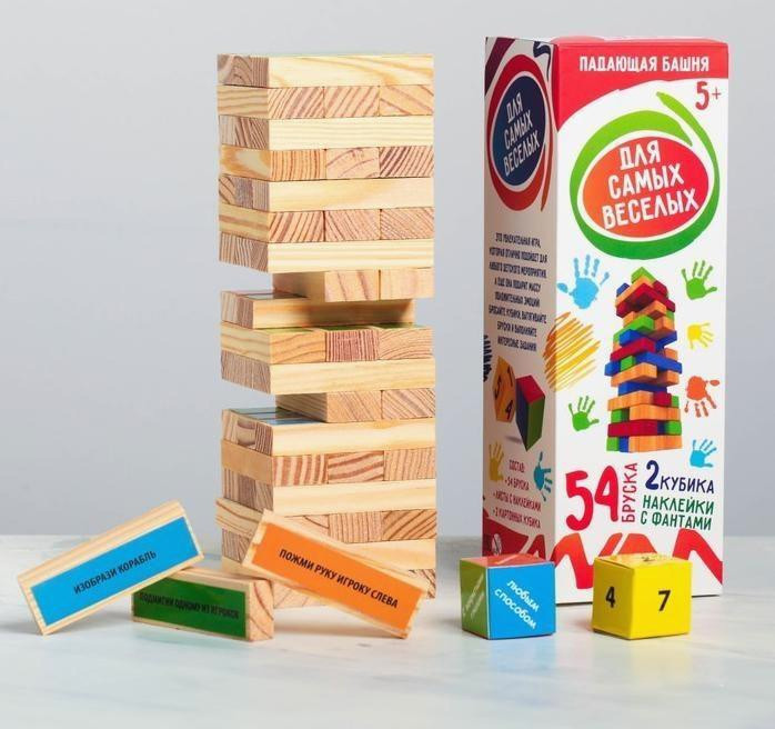 Играть падающей башней очень просто. Вам необходимо построить разноцветную башню, кинуть 2 кубика с цифрами и цветными гранями, вытянуть необходимые бруски в соответствии с выпавшими кубиками и расположить их сверху. Но не все так просто! На каждом бруске написано задание, которое должен выполнить участник. Наклейки с фантами не повторяются, потому процесс игры будет невероятно веселым и непредсказуемым. Падающая башня привлечет несколько поколений и будет собирать вокруг себя большие компании.