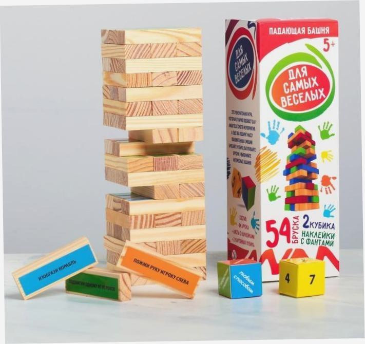 Играть падающей башней очень просто. Вам необходимо построить разноцветную башню, кинуть 2 кубика с цифрами и цветными гранями, вытянуть необходимые бруски в соответствии с выпавшими кубиками и расположить их сверху. Но не все так просто! На каждом бруске написано задание, которое должен выполнить участник. Наклейки с фантами не повторяются, потому процесс игры будет невероятно веселым и непредсказуемым. Падающая башня привлечет несколько поколений и будет собирать вокруг себя большие компании.