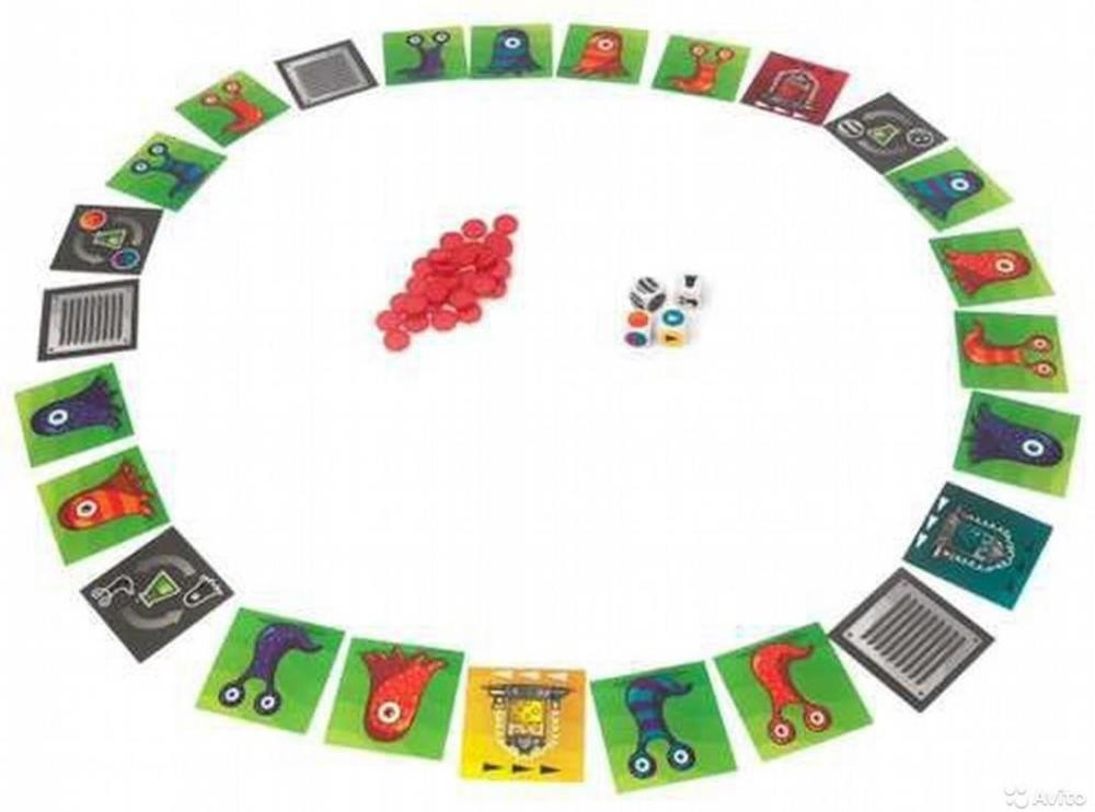 Состав игры: 25 карт амёб из лабораторий, 4 специальных игровых кубика, 30 призовых фишек, правила игры на русском языке отдельно, жестяная коробка.