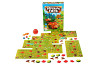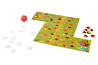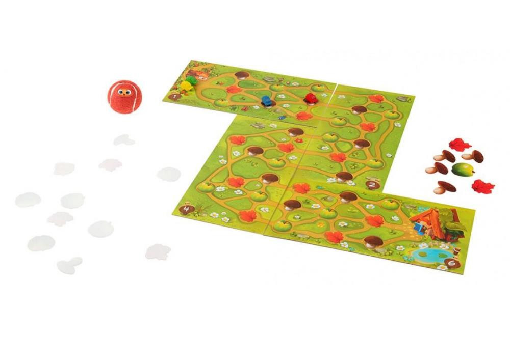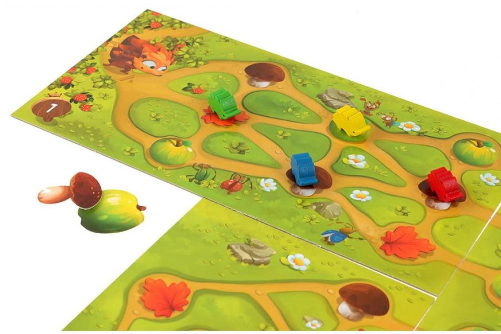 Вместо кубика в игре – круглый мячик с ежиной мордочкой, его нужно прокатить по специальным жетонам-липучкам, чтобы определить свой путь. Сколько шарик собрал грибочков и яблочек, на столько клеток вы пройдете вперед. Важно чтобы путь строился по тропинкам и на те клетки, которые совпадают жетонам. То есть, поймав себе два гриба и яблоко, вы можете переместиться только на две клетки с грибом и одну с яблоком.