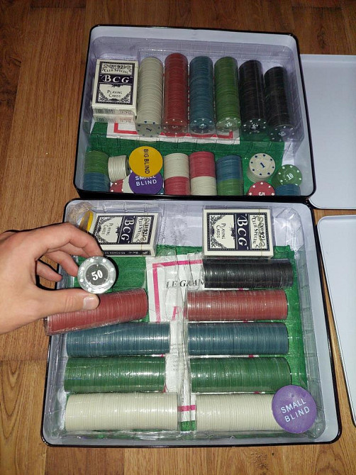 В комлекте в общей сложности 1000 фишек с номиналом, 4 колоды карт, 2 сукна, фишки с блайндами, фишка дилера.