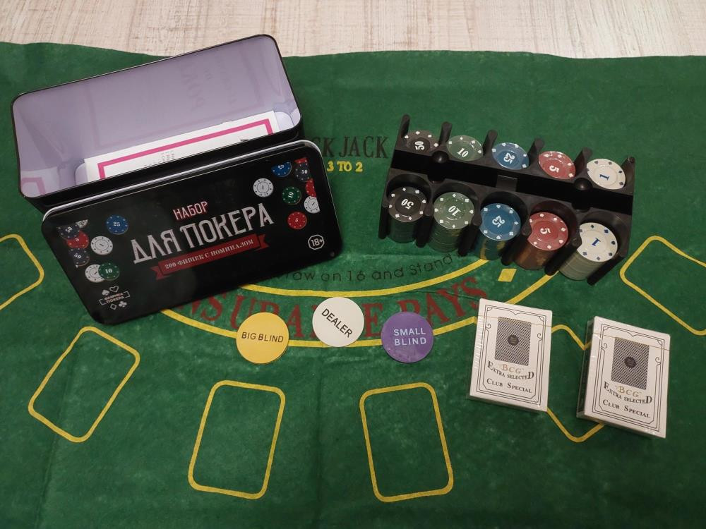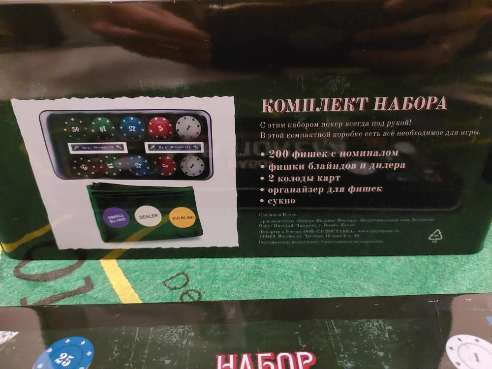 Новый покерный набор, фишки и карты запакованны. Набор: сукно, 200 фишек, 2 колоды карт, органайзер для фишек, фишки блайндов и дилера. Отличный подарок на новый год)