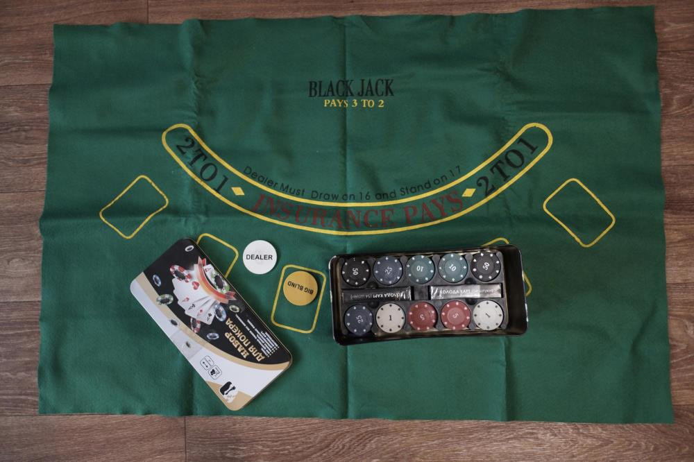 Отличное состояние.200 фишек,сукно,фишка дилера,2 дополнительных фишки,2 колоды карт(одна не вскрывалась).