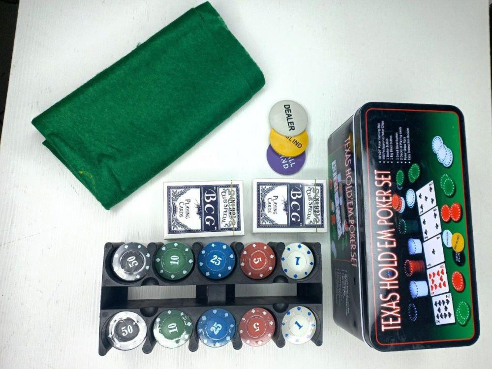 Покерный набор состоит из 200 фишек . Имеются фишки номиналом 1, 5, 25, 50 и 100 единиц. Набор для покера содержит две колоды, каждая из которых включает 54 карты. В комплект также входят малый и большой блайнды, фишка дилера и настоящее зеленое сукно прямоугольной формы с необходимой для игры разметкой.