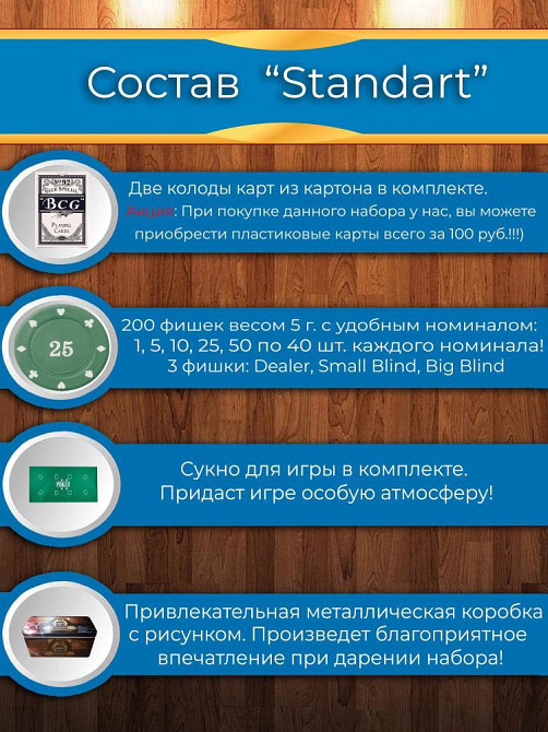 1. 2 колоды картонных карт по 54шт. (при покупке данного набора, вы можете приобрести отдельно пластиковые карты всего за 100 руб.)