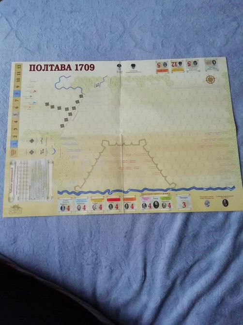 Настольная игра Полтавская битва. Полный набор. Карта, фишки, правила, кубик. Состояние почти новое, на фото приходилось выбирать больше общий план, поэтому не сильно четко. Размер примерно метр на полметра