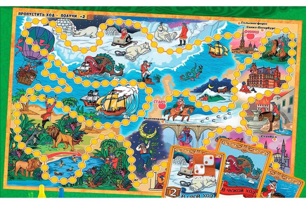 Красочная ходилка, обманчиво подходящая только малышам, на самом деле, может быть интересна и взрослым. Пройти по стопам известного барона, хитрить и изворачиваться ради достижения финишной клетки, вот что предстоит делать игрокам. Два способа игры, указанные в правилах, помогут на равных соревноваться и взрослым, и детям. В этой красочной бродилке можно провести не один вечер с семьей или в компании друзей!