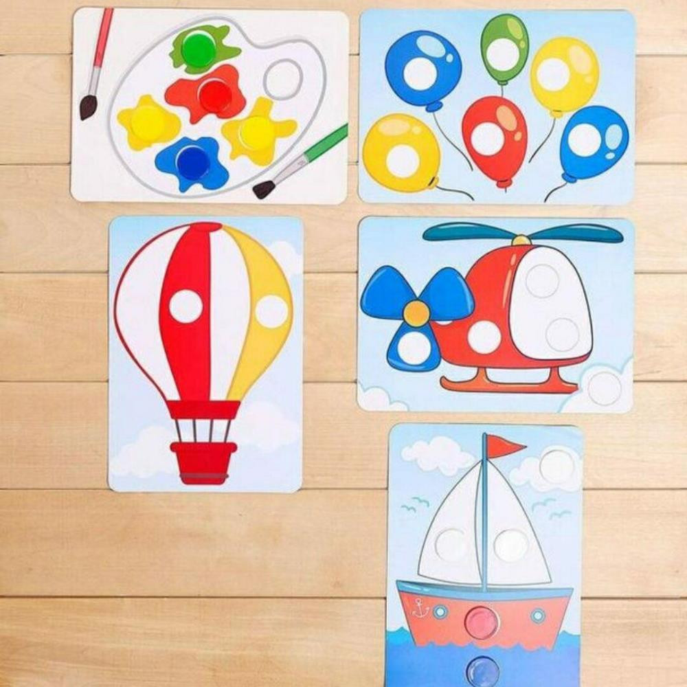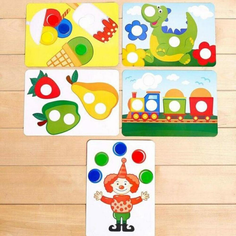 Попросите ребёнка взять карточки из набора и дополнить изображения фишками нужных цветов.