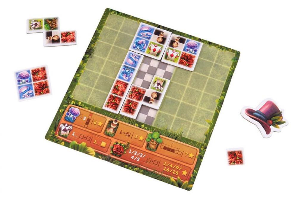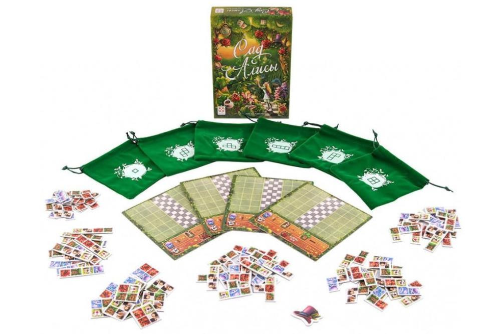 В настольной игре «Сад Алисы» игрокам нужно грамотно распределять кусочки с садом на своих планшетах. Карточки, или тайлы, с нарисованными объектами, имеют разную форму. Больше всего похожи на фигурки из тетриса. Каждый по очереди выбирает участок и пристраивает его на личный планшет. Каждый ход игроков проходит под надзором Королевы, точнее – её условий. Выставляя что-то, игрок должен принимать их во внимание, если хочет набрать как можно больше очков.
