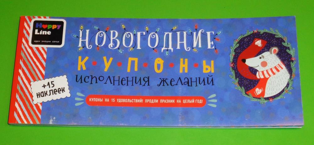Новогодние купоны. Новая. Подходит как детям, так и взрослым. В новогоднюю ночь, везунчику (можно подстроить, что это выиграл именно ребёнок) достаётся счастливая возможность исполнения 16 желаний (в книжке 16 купонов). Тот кому вручают купон должен обязательно исполнить желание написанное (напечатанное) в купоне, в указанный срок. Например: Целый день никаких домашних обязанностей или пицца с доставкой на дом.