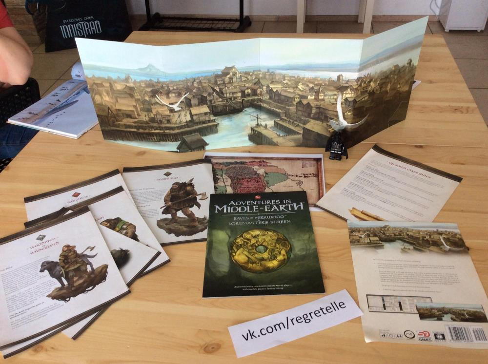 Ширма для настольной ролевки, использующая правила D&D5 и сеттинг Властелина колец. На картинке пейзаж Озерного города. Удобна для мастера, скрывает броски и даёт доступ к справочным материалам и таблицам. В комплекте цветные прегены для игры, ламинированная карта регионов и приключение «Под сенью Лихолесья».