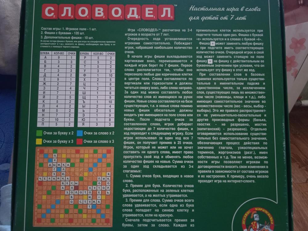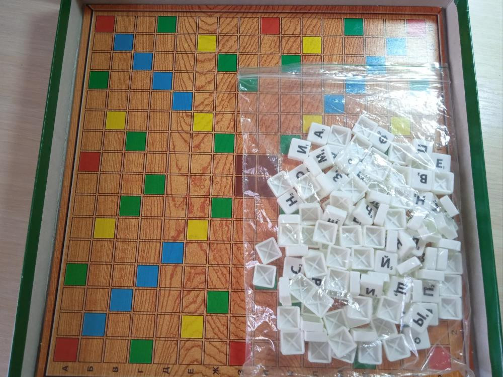 Настольная игра для всей семьи, аналог эрудита. Коробка плотная, большая (27×27). Внутри картонное поле и пакет с фишками. Игру использовали немного: фишки и поле в идеальном состоянии, на коробке есть небольшие потёртости.