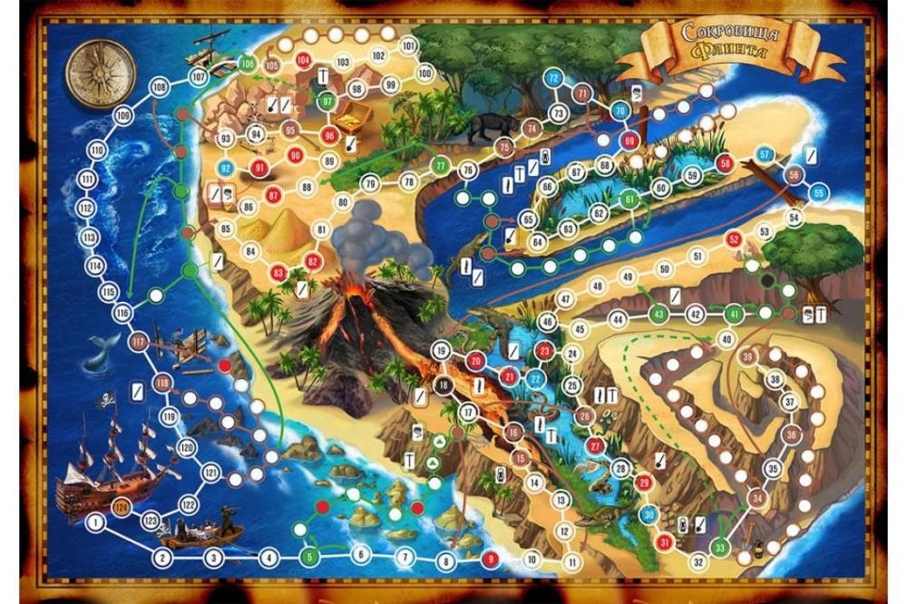 Играть в Сокровища Флинта очень просто - игроки по очереди бросают кубик и перемещают свои фишки по клеткам игрового поля. Часто путники будут стоять на развилке и выбирать: пройти по длинному, но безопасному пути, либо по кроткому, но полному опасностей.