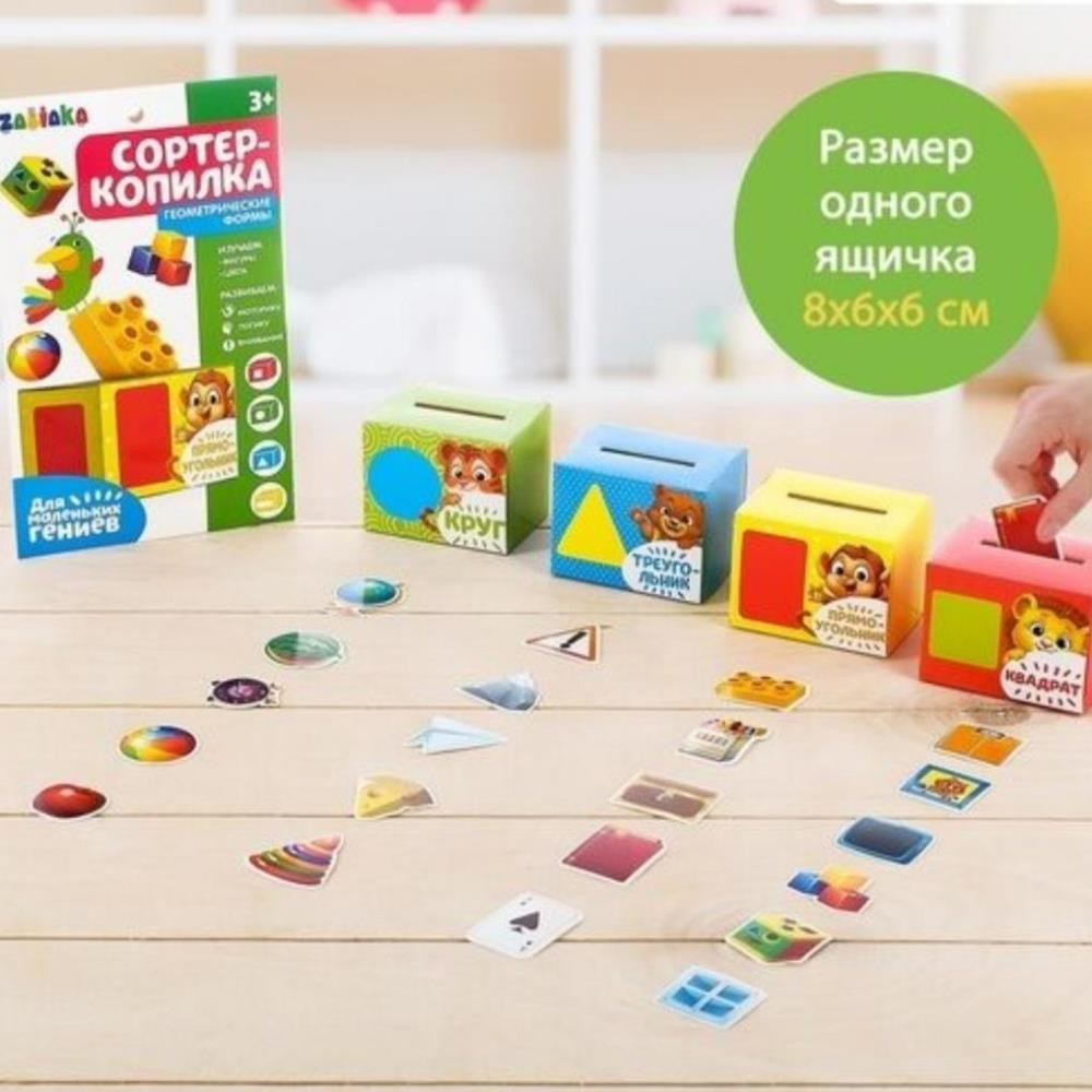 Игра «Сортер-копилка» поможет ребёнку запомнить простые геометрические формы и немного узнать об окружающих его предметах.