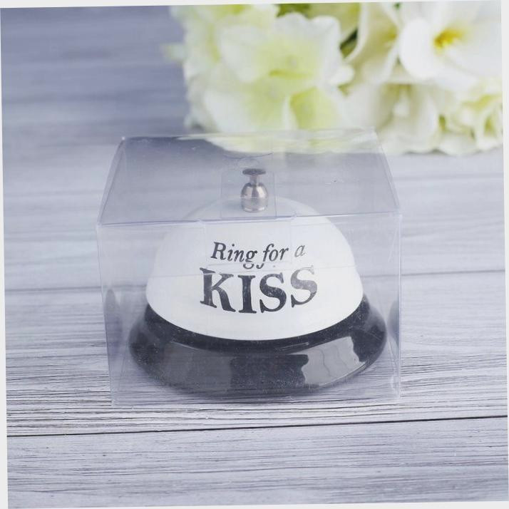 Настольный звонок белого цвета с надписью Ring for a kiss. Хороший подарок для "второй половинки", для знакомой пары или себе в семью, чтобы оповещать о времени для любви. Сделан из металла, диаметр 7.5 сантиметра, изящная кнопка звонка. Звенит громко. Поставляется в прозрачной коробочке.